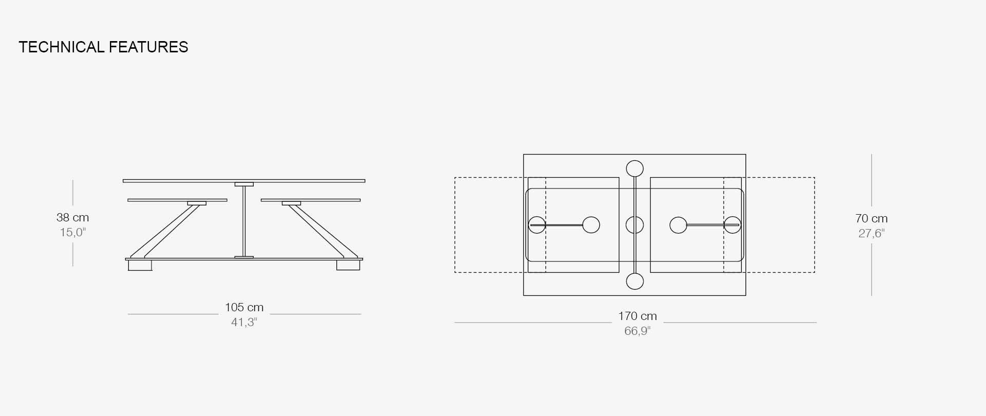 Kích thước: 105/170 x 70 x cao 38 cm (mặt bàn hcn 105×70 cm – mở rộng 170 x 70 cm, cao 38 cm)