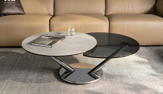 Bàn trà Italia BIO Thiết kế: A. Casati. Bio là sự hòa quyện giữa nghệ thuật hình khối và kỹ thuật chế tác tinh xảo. Chiếc bàn sofa mở rộng này nổi bật với các mặt bàn xoay đồng bộ, có thể tùy chọn giữa kính trong suốt hoặc Đá Ceramik, tạo nên vẻ đẹp